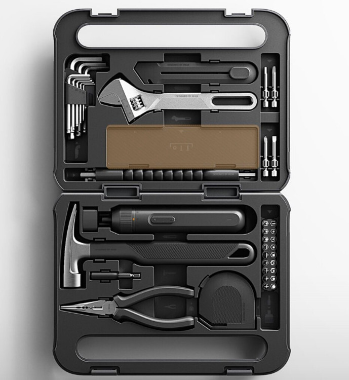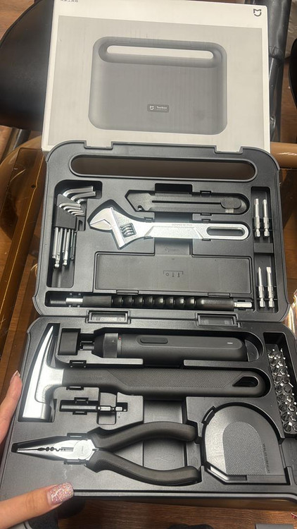 آچار قابل تنظیم-انبردست چندکاره-چکش (پنجهدار)-چاقوی کاربردی-متر اندازهگیری (3 متر)-پیچگوشتی (بیتست)شامل چند بیت کوتاه و بلند-کلید آلن / آلنکیش